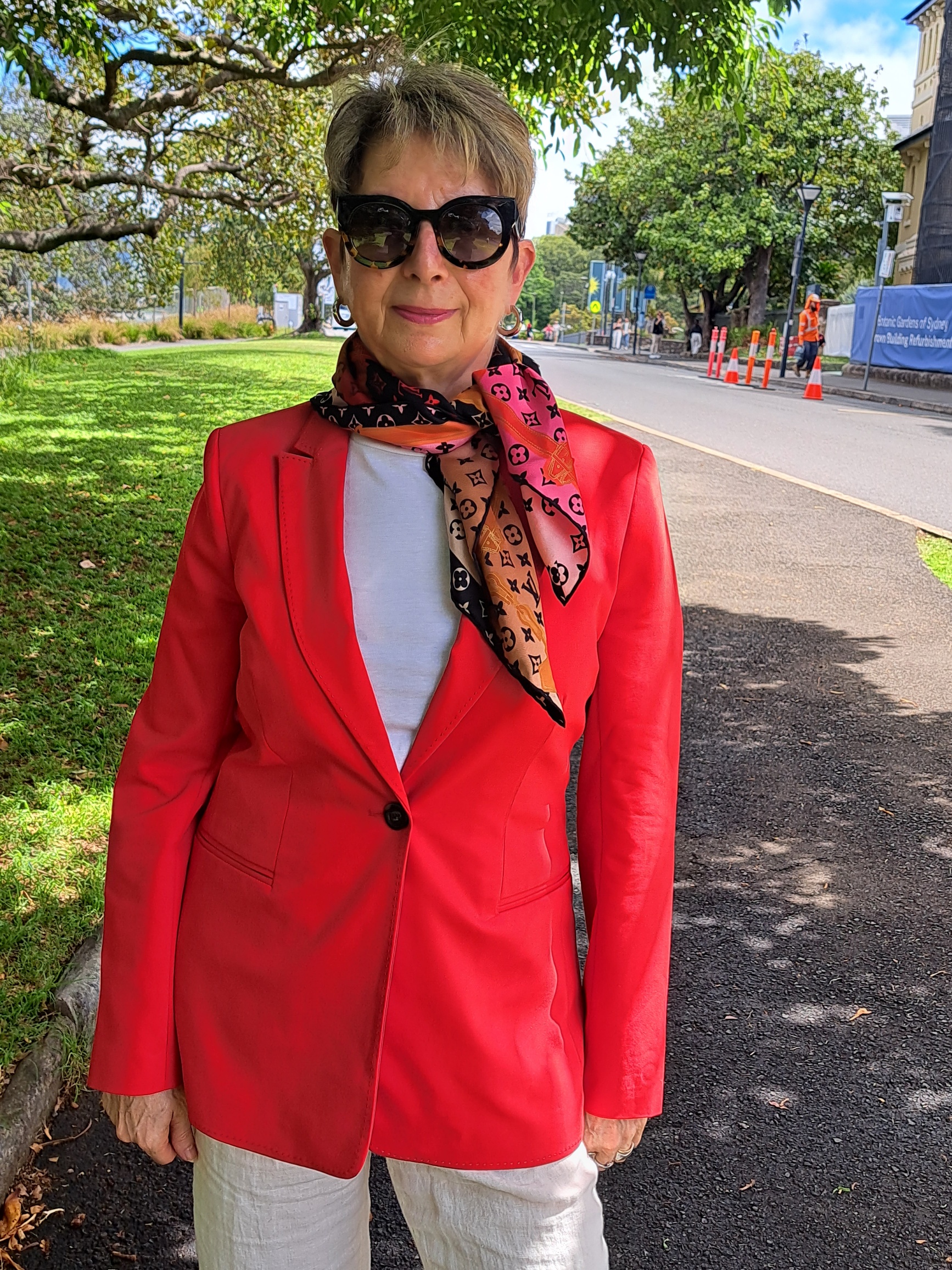 We are both love and respect art so for this particular outing I chose to wore my linen pants topped up with a simple white t-shirt but then I put on my red classic blazer from David Lawrence and accessorized with my new LV scarf to elevate this casual outfit to another level.